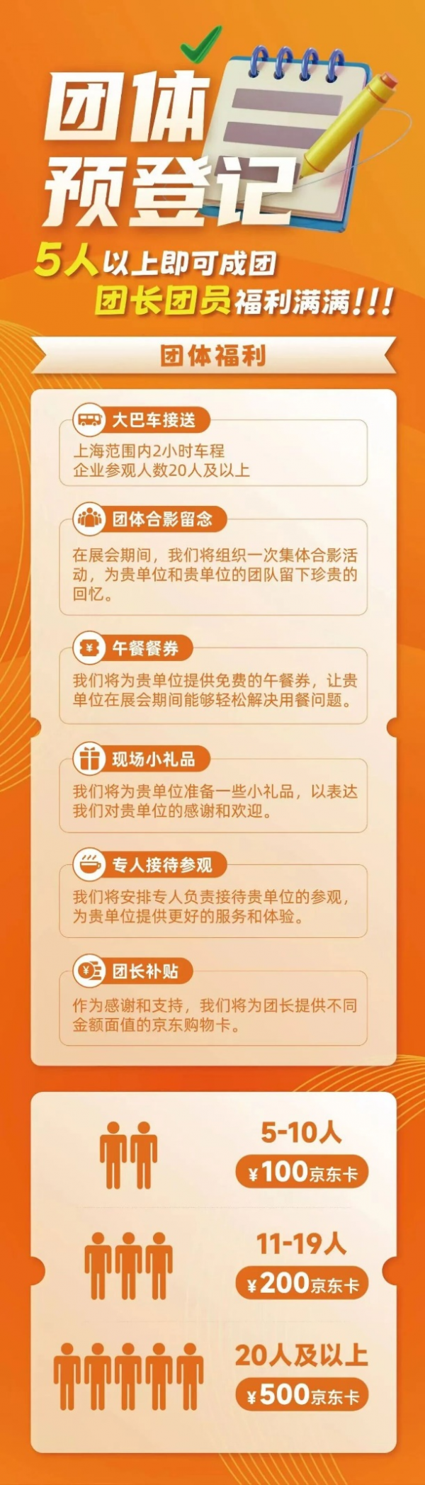 我們為組團參觀準備了大巴車接送、午餐、團長京東福利卡、現場禮品、留念合影等, 5人以上即可成團,人數越多、福利越多!